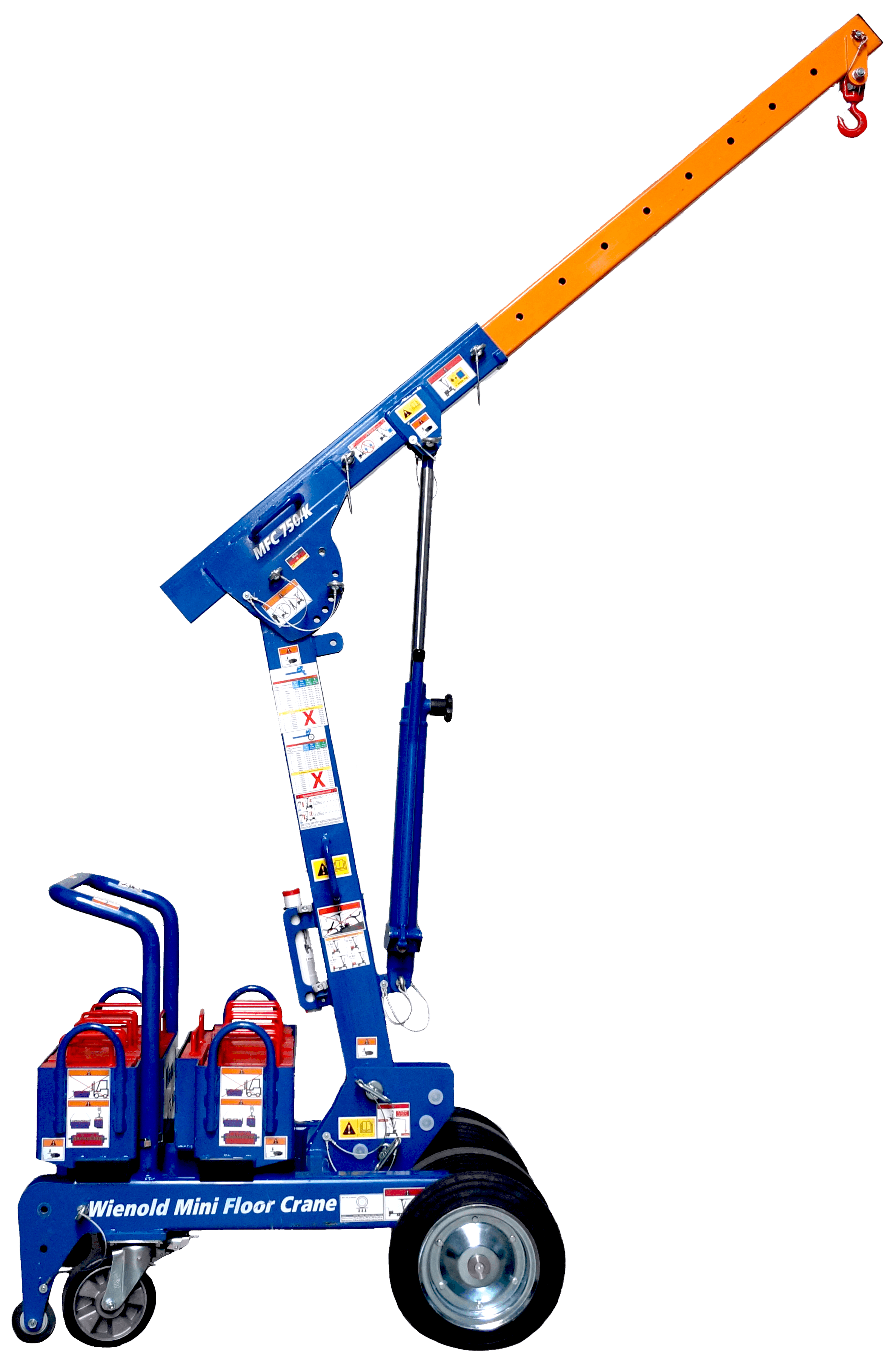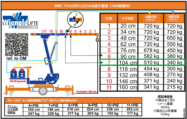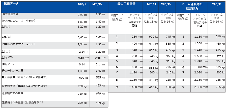 MFC750/Kは後方支持脚を備えたロングタイプであり、各脚には14個のカウンターウェイトを収めたボックスが1つまたは2つ装備されています。MFC750/Kは、フック高2.90mで最大900kgの荷重を安全に吊り上げ可能です。クレーンのアームを最大1.40mまで伸ばした場合、410kgの吊り上げ能力が確保されます。