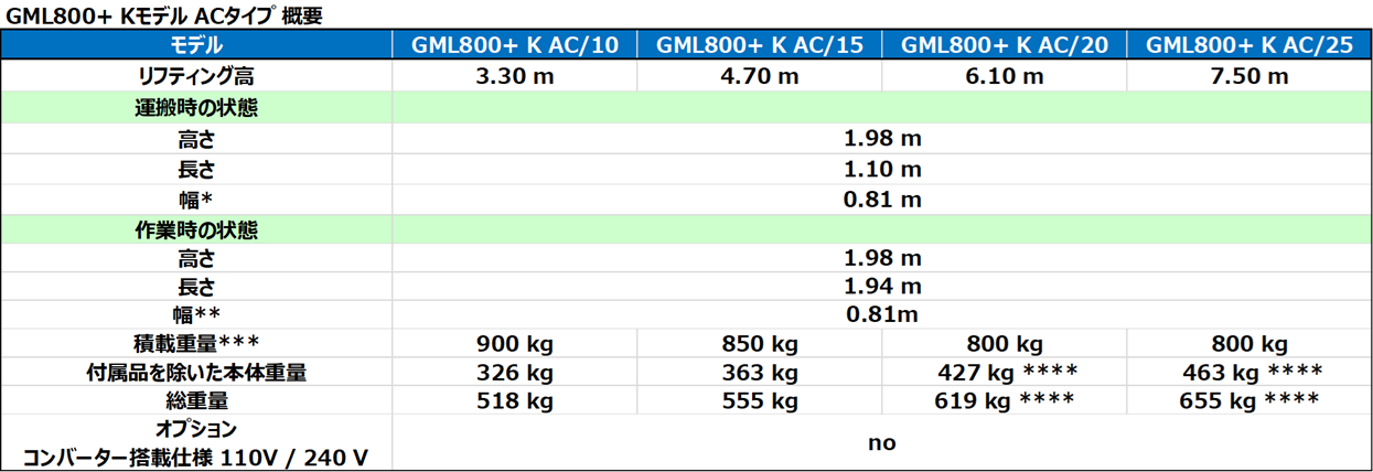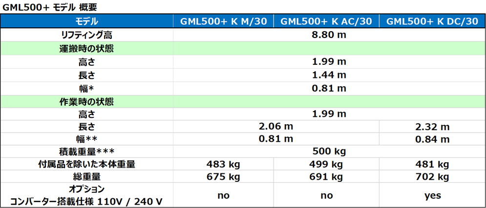 GML500+シリーズには、マニュアル(M)、AC、DCの3タイプがあり、いずれも最大500kgの荷重を8.80mまで持ち上げることができます。ACモデルとDCモデルには強力な電動ウインチが搭載されており、ボタン操作でスムーズな昇降が可能です。