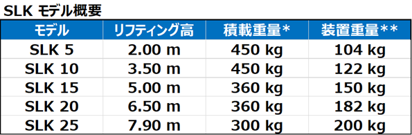 さらに、SLKには積載能力に応じた4種類の昇降高バリエーションが用意されています。
