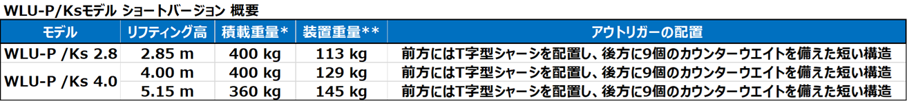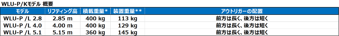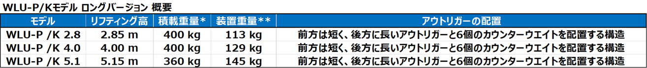 ** 付属品除く本体重量 WLU-P 20シリーズは、サイドアウトリガーを含めて本体重量に9kg増
